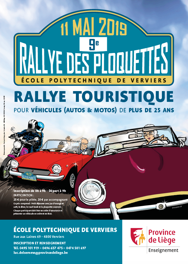 Lors de la journée Portes Ouvertes du 11 mai, l’Ecole Polytechnique de Verviers proposait une balade pour véhicules ancêtres (voitures et motos) de +/- 95 kms. Ce 9ième rallye des Ploquettes s’est déroulé par un temps très humide et frais au départ, mais se remettant en fin d’avant-midi.