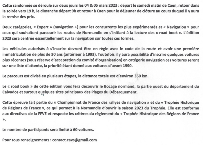 Le CAVS Normandie (Club des Amateurs de Voitures de Sport) organise les 4 et 5 mars 2023 le 3e Normandie Classic Rally ;