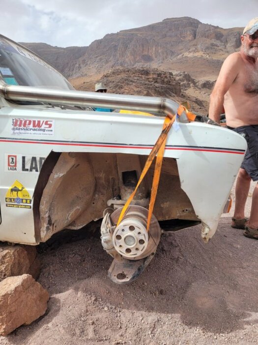 6ème étape pour rejoindre Tinghir par la splendide vallée du Todra, plus loin la Lada perd une roue arrière mal resserrée par un garagiste local, puis casse d’une rotule de suspension avant droite qui sera bricolée par notre mécano engagé.