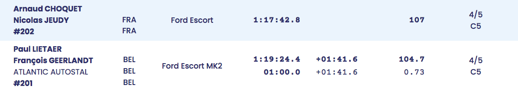 Arnaud Choquet (Escort), auteur du grand chelem (quatre meilleurs temps sur quatre), a plus que doublé son avance dans la dernière spéciale au programme de cette première journée : Pol Lietaer (Escort MK2) qui concède 20s3, pointe à 55s7. Dans les Groupes 1 à 5, le troisième, Edouard Proffit (Escort MK1) est à 2min47s4. Dans le Groupe AJ/BJ/NJ, Jean-Louis De Roeck (BMW M3) laisse à plus de 30s, les R5 GT de Clément Sellier et Thomas Caron jouer ensemble (14s3 d’écart). Christophe Fusillier a été distancé. Les 205 GTI de Serge Blanquart et Franck Radet sont séparés par 0s3. En Classic, Claude Debue (Ascona) possède 12s4 d’avance sur Christophe Berteloot (911 SC), Thierry Deffontaine (325i) est à 1min.