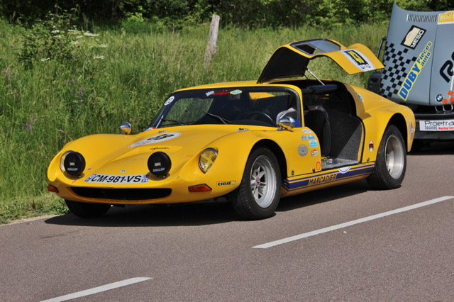 Une Porsche 906 ayant gagné les 12 heures de Sebring en 1966 en catégorie 2 litres aux mains de Hans Herrmann ; Une F1 Cooper T53 venue de Suisse en compagnie d’une belle barquette Lotus 23 B de 1962. Le musée Abarth pieusement gardé par la famille Pont reste fidèle de cette montée et avait pour l’occasion sorti une 1000 SP, une 2000 et une X1/9 Prototipo avec son fameux périscope à air ! Une actrice des belles années de la course de côte avec la barquette NSU Cuynet aux mains de Florent Cuynet. La palme de la curiosité revient à la Mean Sonora, petit constructeur belge des années 60 et 70. L’un des rares châssis encore existant dans une livrée jaune et motorisé par un bloc Alfa avec un train avant de R8 – A l’époque le client avait le choix entre une multitude de motorisations allant de Flat 4 VW, de Ford V4 ou V6, de Renault, de Simca, de NSU et bien évidemment du double arbre Alfa Roméo. Chaque exemplaire survivant est quasiment unique.